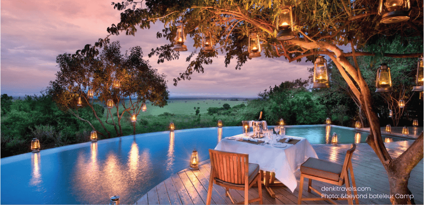&Beyond Bateleur camp gives you the chance to enjoy an exclusive luxurious out door dining. There is no more specific menu since the guest is at privilage to discuss the meals ahead by the chefs. A bush dinner at the out in the southern camp gives you a captivating moment not forgetting dinner by the poolside as you gaze at the stars while they twinkle and shine out bright releasing a marvelous view out in the darkness. What about your breakfast and lunch? do you prefer it indoors or outdoors? enjoy your moment of bush breakfast by the Mara river as you listen to the rustling speedy waters beside you. Talk out to your chef to prepare you a delicious hearty picnic lunch such that you can get stomach satisfaction out there in the wild.
