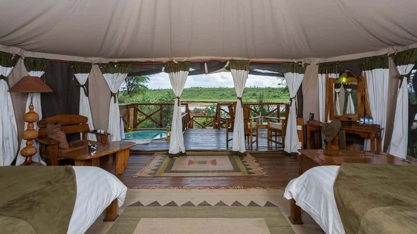 The lounge and dining area is decorated with vibrant safari style. When the weather is permitting, breakfast and lunch can be served on the banks of the Ewaso Nyiro river under the shade of the trees and is referred to as al fresco. The restaurant offers a continental cuisine thus, favoring every guest. A 3 course meal is served during lunch while a 4- course meal is served at dinner. Private meals can be arranged on the guest tent verandas or under the stars.