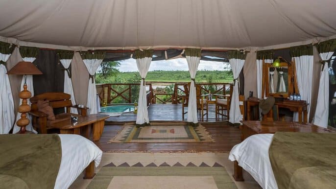 It has 14 spacious tents which are rustic decorated with African touches offering all sorts of comfort. Initially it had 12 safari tents for its guests which has private decks, ensuite bathrooms with twin basins, laundry, Wi-Fi, comfortable beds with traditional furnishings, charging facility and a large veranda. The 2 new tents are luxurious suites with a bathtub, external shower, safes and a two way radio for communication with the staff. The rooms have either a one king sized bed or 2 queen sized beds, sofa, coffee table, dressing table and an attractive soft furnishing. Honeymoon rooms have a romantic setting, which gives a relaxation adventure and personalized services not forgetting a private plunge pool.